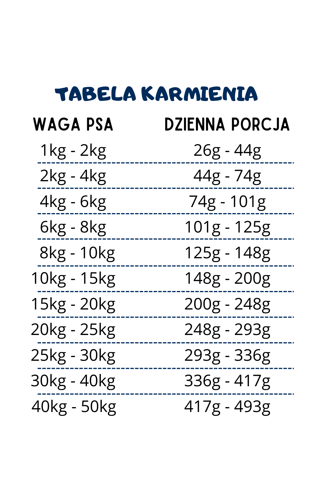 Nasza karma to nie tylko pełnowartościowe posiłki, ale także codzienna porcja zdrowia i energii. Dzięki naturalnym składnikom, prebiotykom i antyoksydantom wspiera odporność, trawienie i dobre samopoczucie Twojego pupila. Wybierając ją, dajesz swojemu psu to, co najlepsze – smacznie, zdrowo i z troską o każdy dzień.